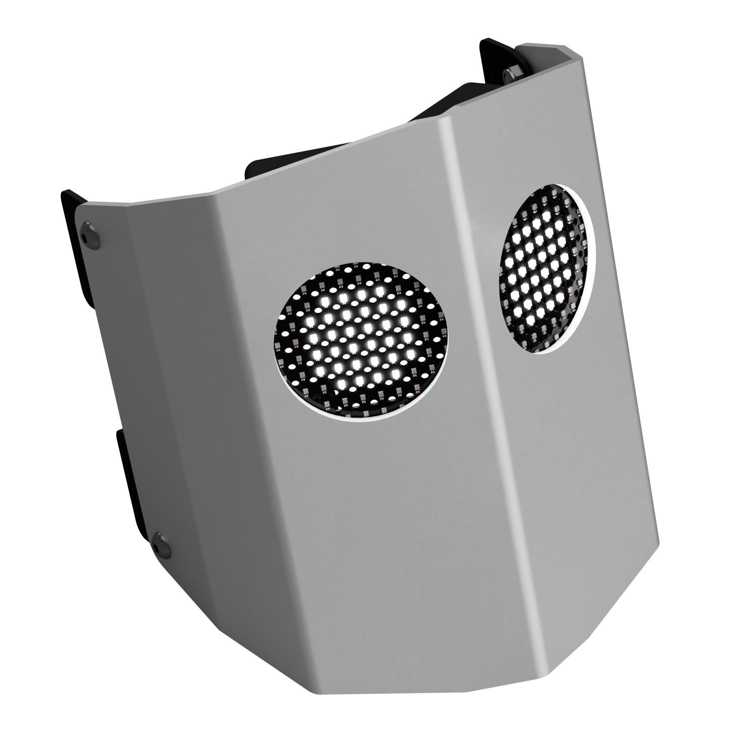 This specific one is composed of a bent aluminium sheet and features two custom see-through LED matrices capable of displaying any low-res RGB image or animation.