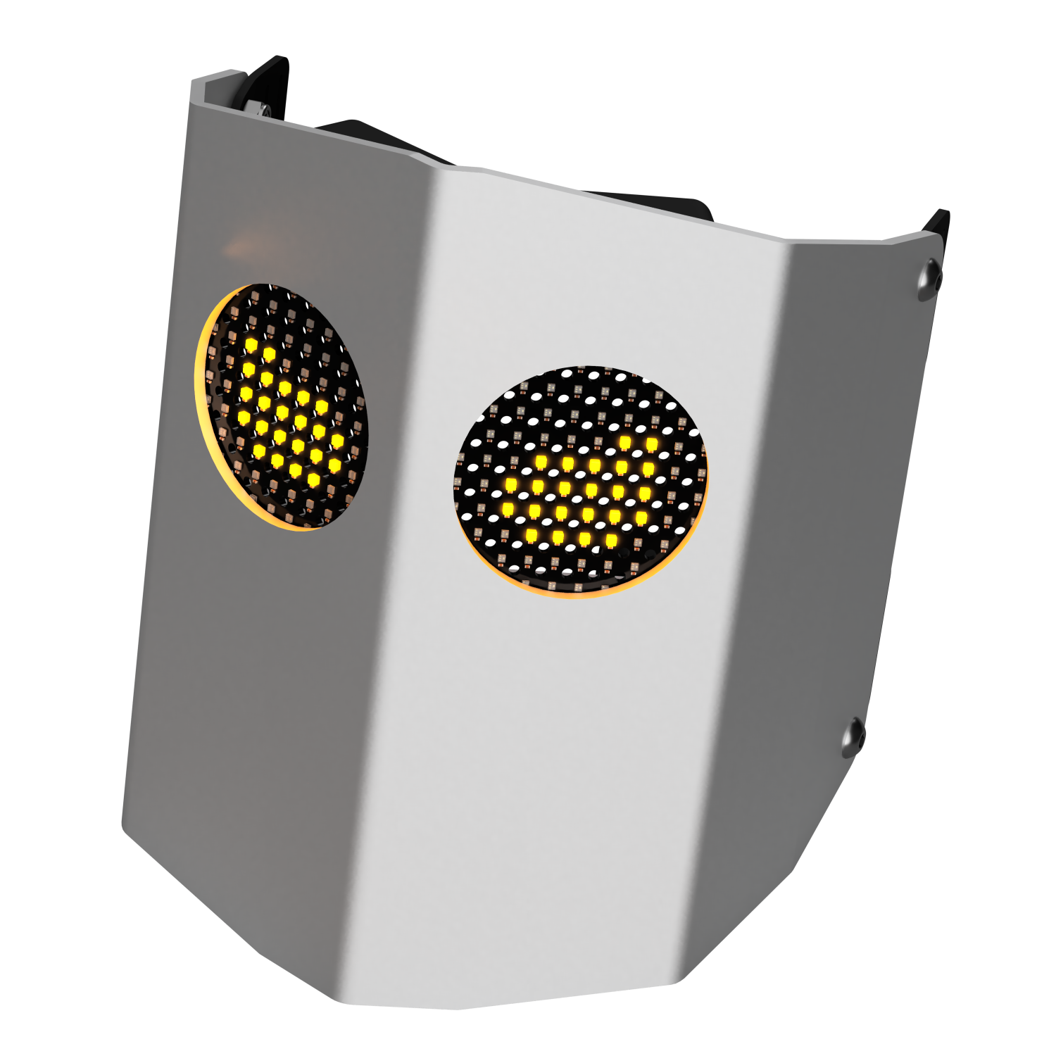 This specific one is composed of a bent aluminium sheet and features two custom see-through LED matrices capable of displaying any low-res RGB image or animation.